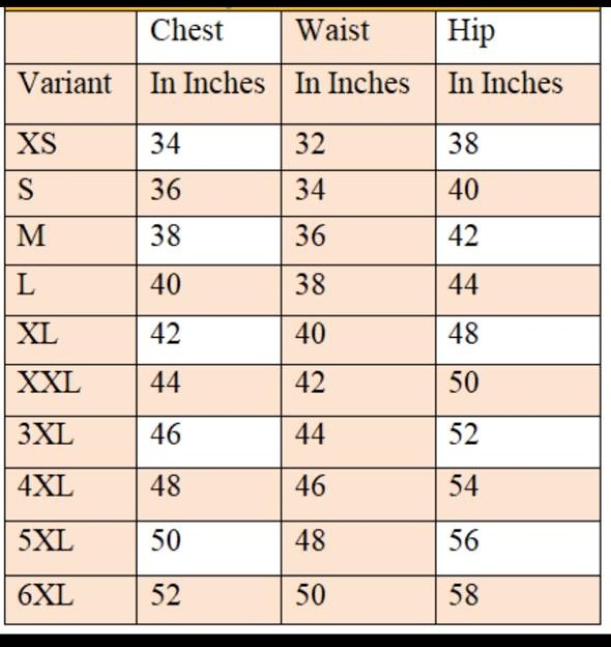Size Guide - Garment Measurements for Top (In inchees)