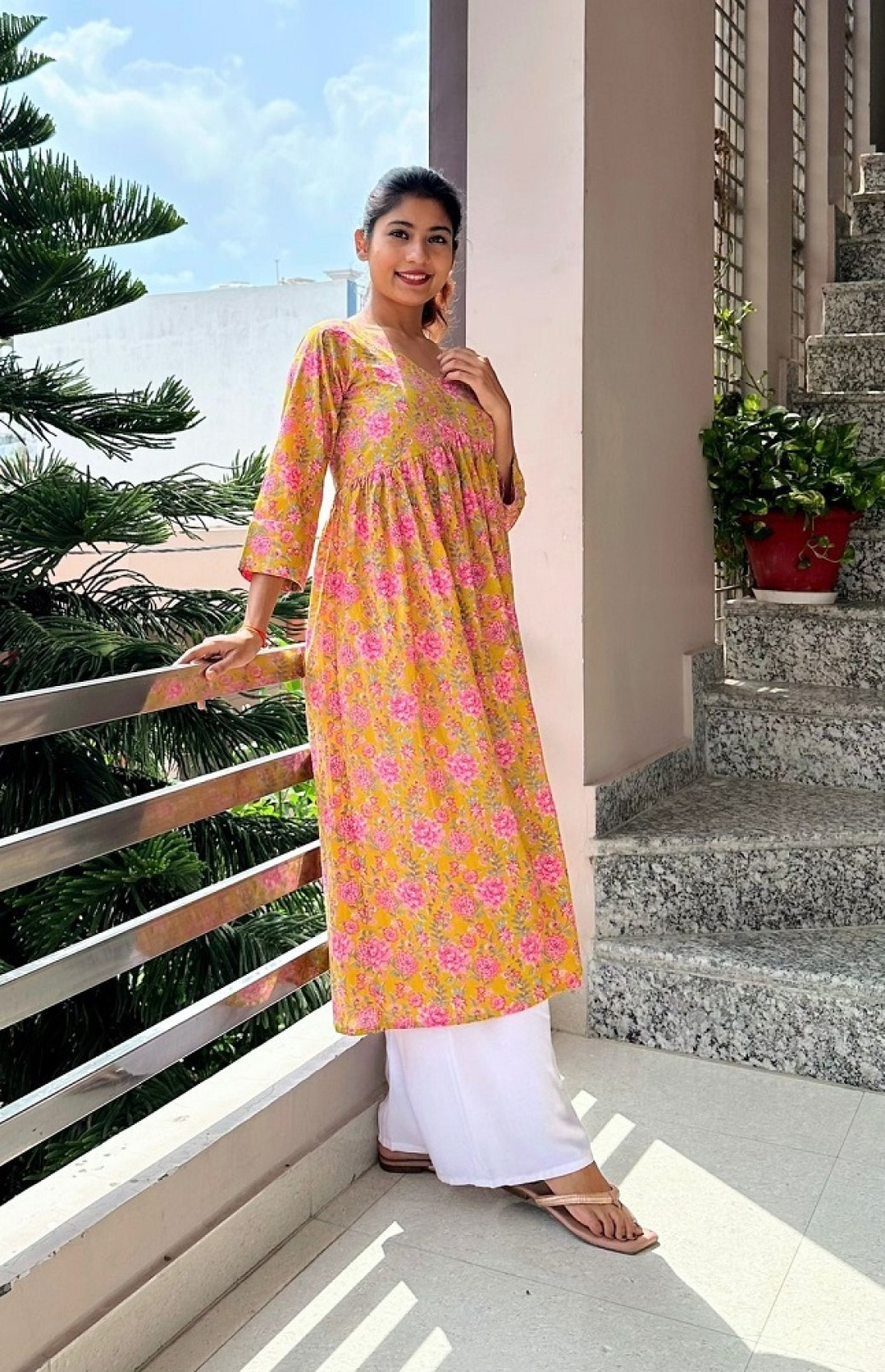 COLOUR : YELLOW WITH PINK FLOWERS